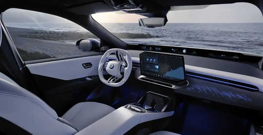 Displej BMW Panoramic Vision promítá informace na celé čelní sklo (od sloupku A ke sloupku A). Střední a spolujezdcova část jsou přizpůsobitelné; klíčové informace o jízdě se zobrazují v zorném poli řidiče.