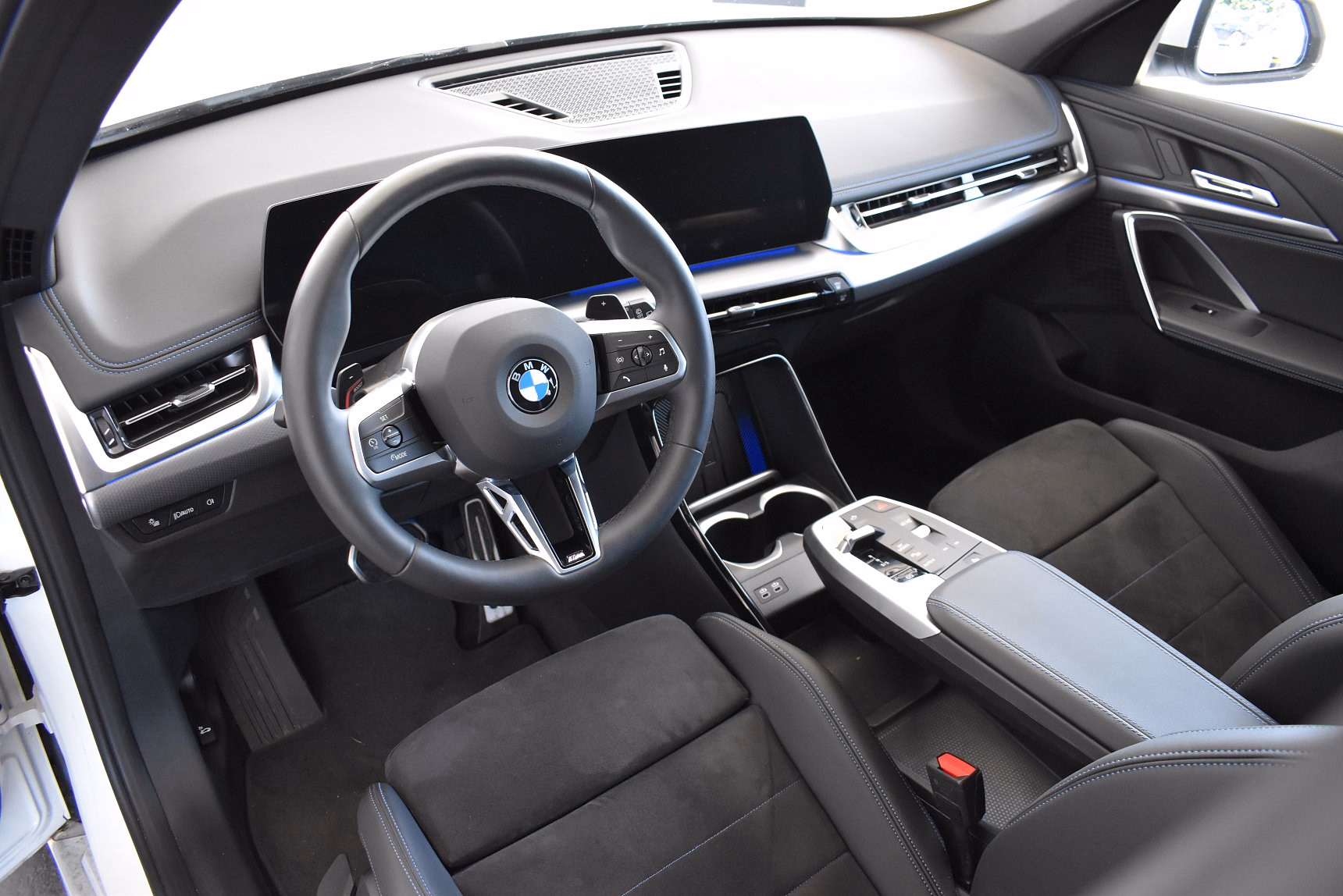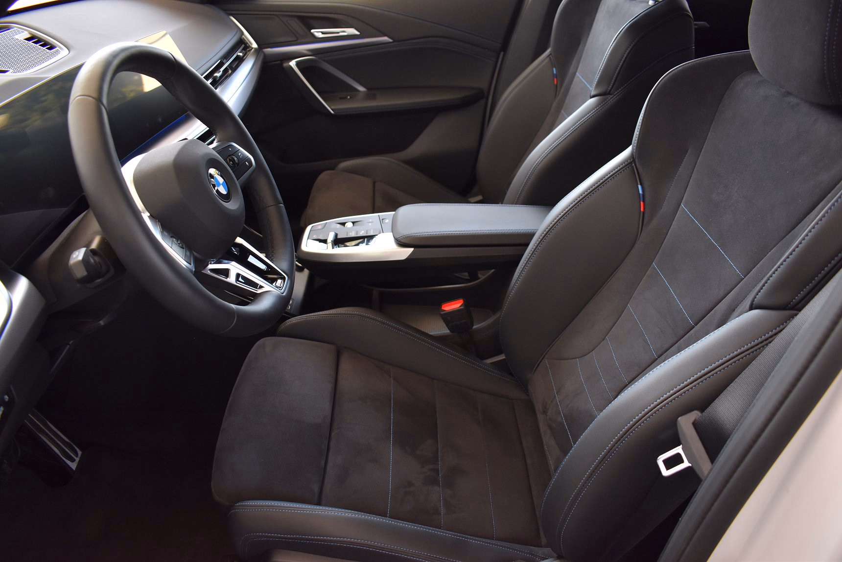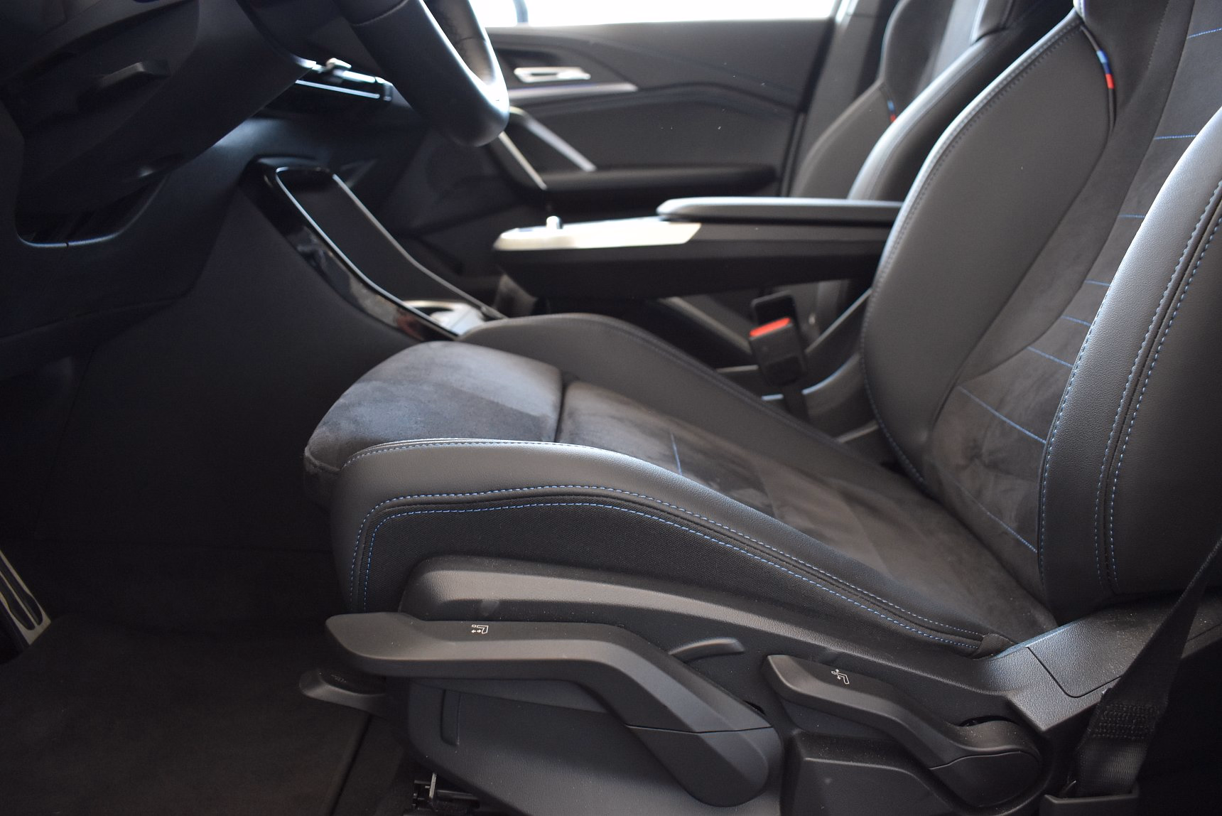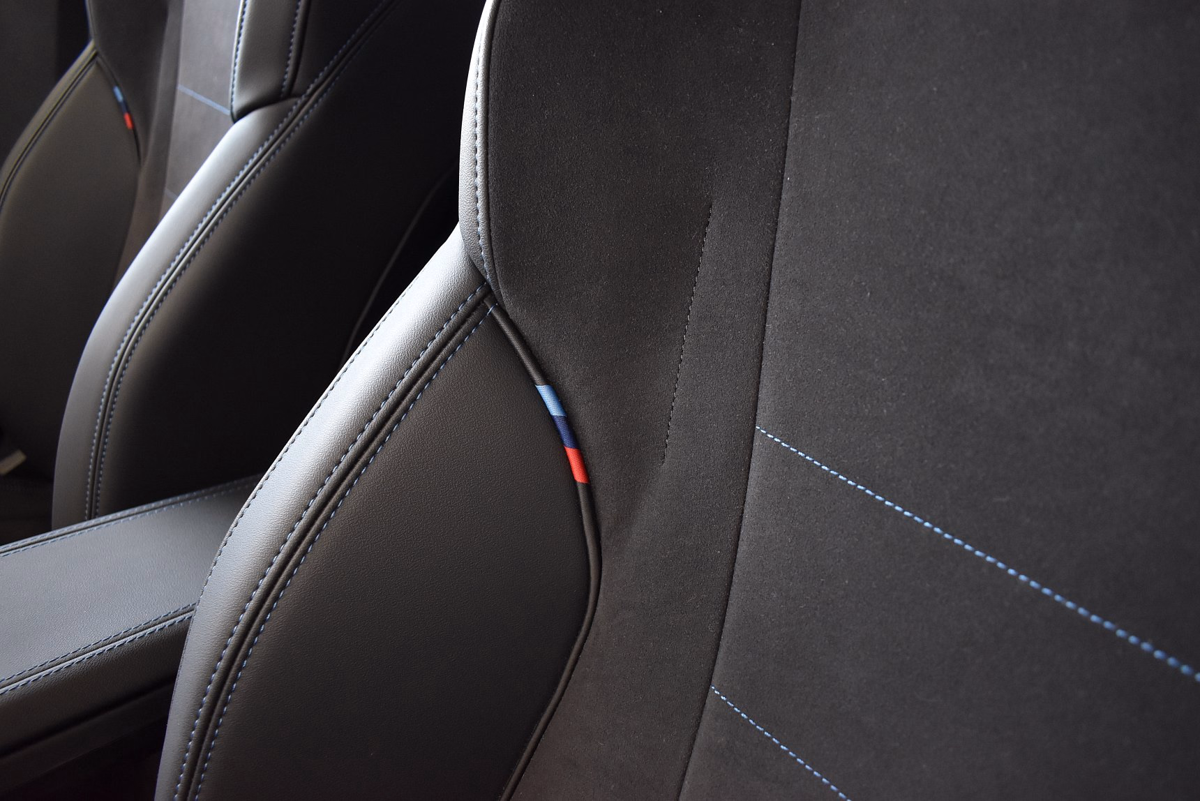 Kombinace M Alcantara / umělá kůže Veganza Black s modrým kontrastním prošíváním