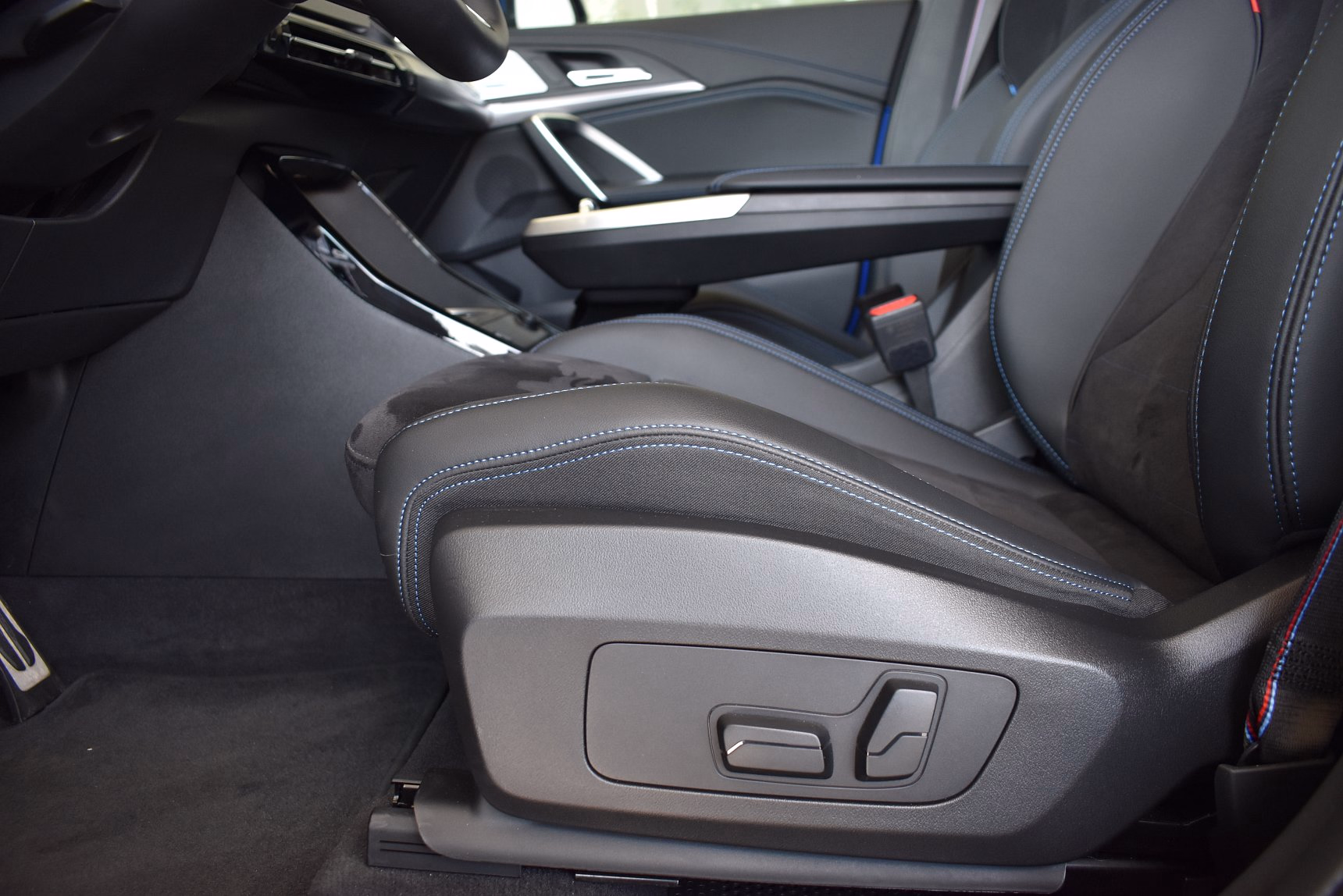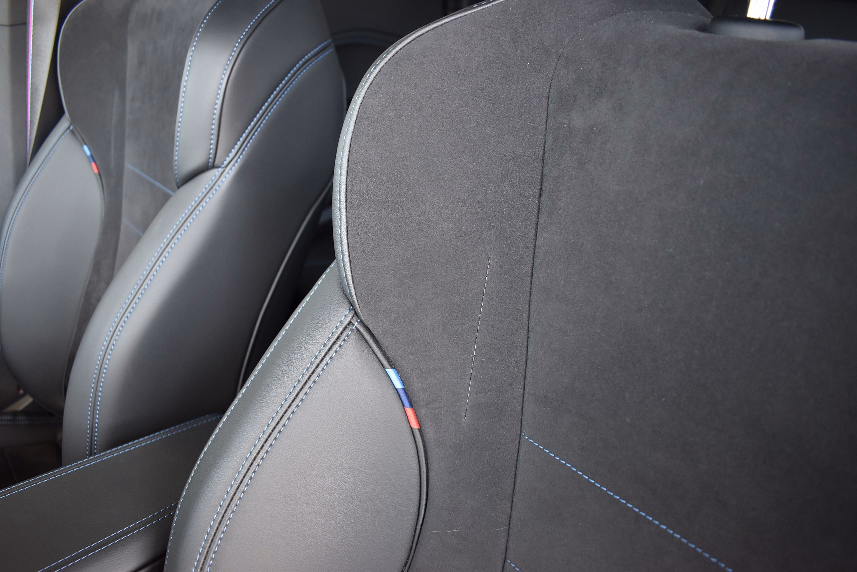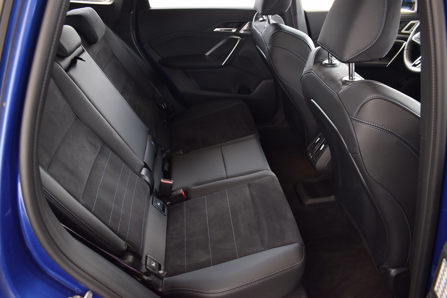 Kombinace M Alcantara / umělá kůže Veganza Black s modrým kontrastním prošíváním