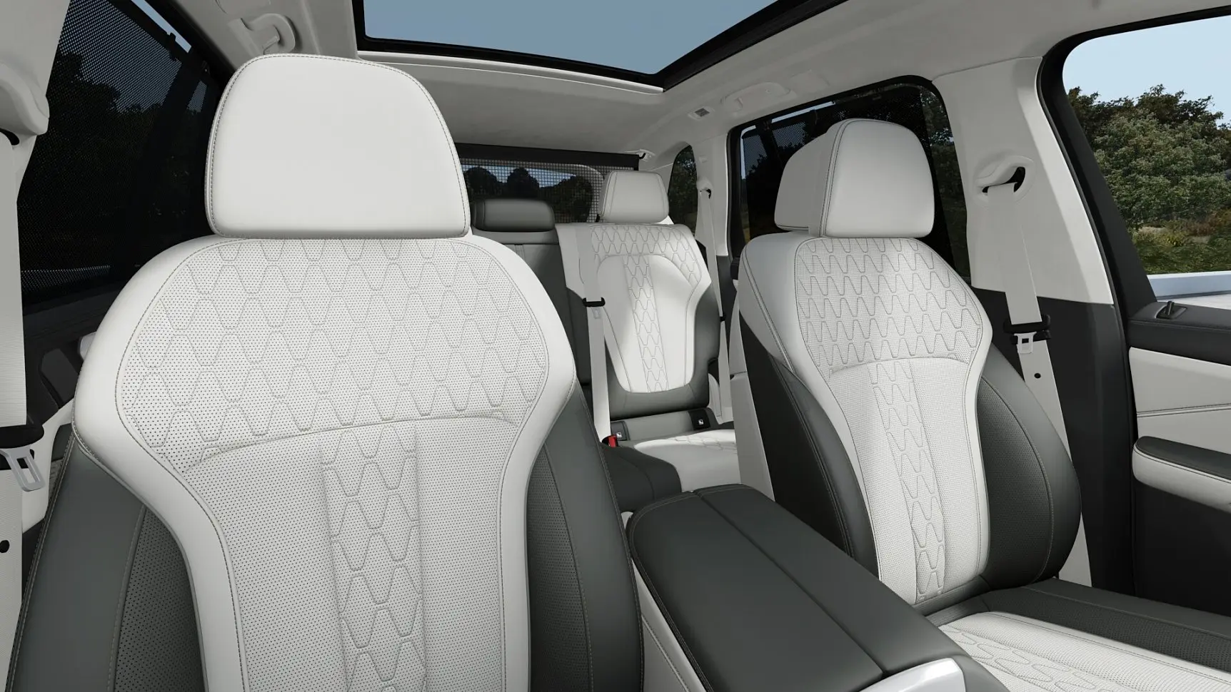 Obě sedadla ve třetí řadě jsou vybavena tříbodovými samonavíjecími bezpečnostními pásy se signalizací nezapnutí. Výškově nastavitelné opěrky hlavy ve tvaru písmene L poskytují řidiči nerušený výhled dozadu. Cestující zcela vzadu mají k dispozici vlastní lampičky a praktické úložné možnosti: síťové kapsy vlevo a vpravo nad loketními opěrkami efektivně využívající prostor. Nechybí ani speciální středová konzola se dvěma držáky nápojů a úložným prostorem. Třetí řada sedadel navíc bez problémů pojme dvě dětské sedačky.