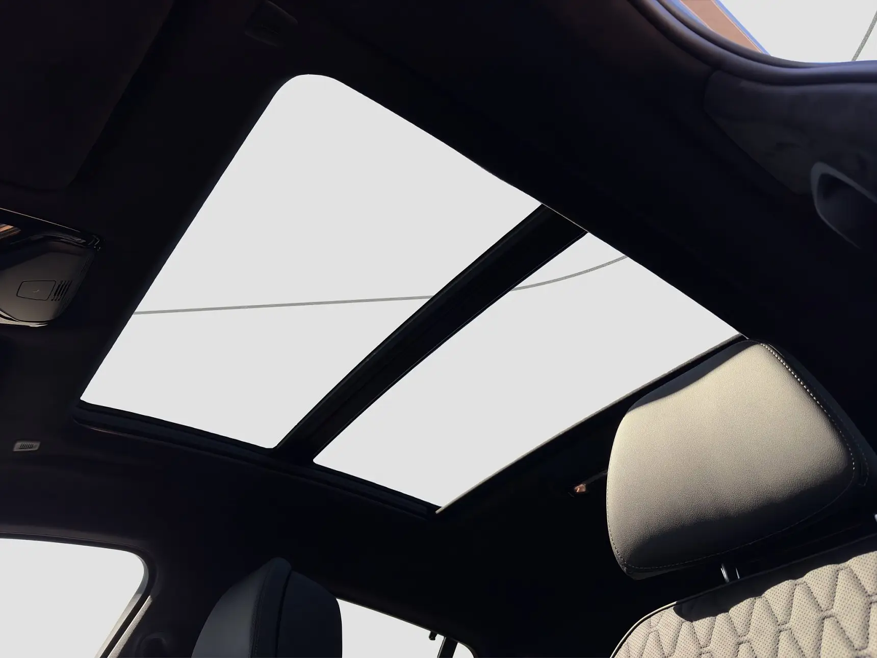 M čalounění stropu Alcantarou v antracitové barvě dodává interiéru mimořádně prémiový a exkluzivní vzhled. Barevně sladěné obložení slunečních clon a střešních sloupků v barvě antracitu působí neobyčejně přitažlivě. Posuvný díl má látkové čalounění.